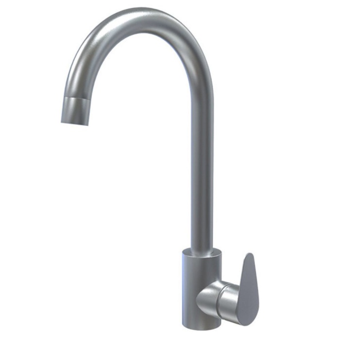 Однорычажный смеситель из нержавеющей стали. Матовая поверхность нержавеющей стали идеально сочетаетя с поверхностью кухонной мойки. Рабочим элементом выступает картридж с керамическими пластинами диаметром 35 мм. Поворотный излив изготовлен из нержавеющей стали и оснащён каскадным аэратором с пластиковой сеткой, делающей струю более мягкой и позволяющей экономить воду. Благодаря крупной гайке, входящей в монтажный комплект,  можно легко и быстро закрепить смеситель на раковине без использования инструментов. Гибкая подводка снабжена накидными гайками G=1/2".