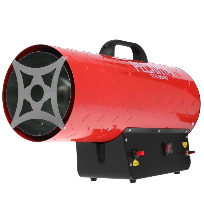 Газовая тепловая пушка Ресанта ТГП-50000 предназначена для отопления помещений площадью до 520 кв.м. Устройство работает на сжиженном газе. Зажигание осуществляется за счет пьезоэлектрического элемента. Металлическая решетка на сопле предотвращает попадание внутрь устройства посторонних предметов. Ручка на корпусе предназначена для удобной транспортировки тепловой пушки.